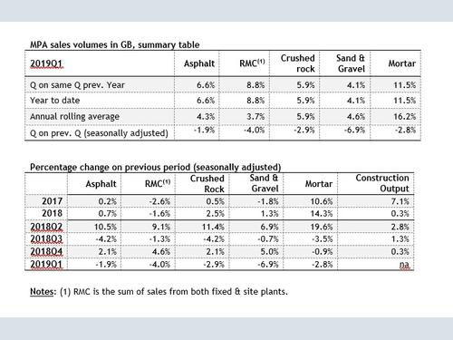 Following an unexpectedly strong performance at the end of 2018, sales volumes of mineral products across markets including aggregates, asphalt, ready-mixed concrete (RMC) and mortar declined in 2019Q1. Seasonally adjusted sales volumes for aggregates had the sharpest decline, down 4.2% compared to the previous quarter, followed by RMC (-4.0%), mortar (-2.8%) and asphalt (-1.9%).
