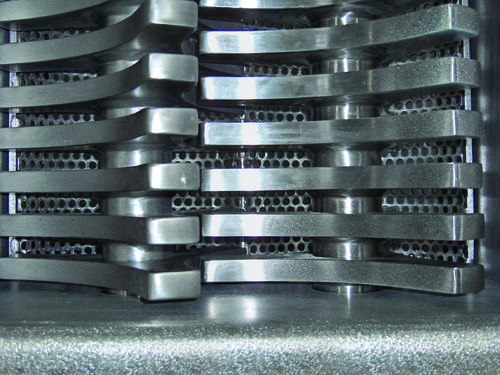 Material entering the 380 mm by 760 mm infeed throat via the hopper is reduced in size by dual rotors with three-point, single-piece, stainless steel breaking heads rotating with minimum clearance inside a curved, perforated bedscreen. On-size material exits through apertures in twin bedscreens ranging from 25 to 64 mm in diameter.