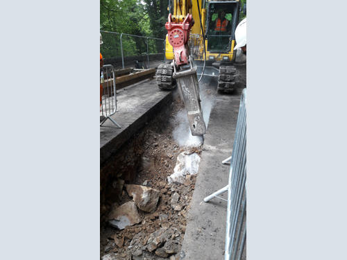 As part of work to relocate Stocksbridge waste water treatment works, JN Bentley were contracted to lay new pipes along Manchester Road. Space was restricted and the team looked at a number of different means to find the best way to break out the rock. Using a 13T Komatsu PC138 machine which was initially fitted with a standard quick hitch, the team began by shearing the walls by hand. Due to the single lane closure, the 13T Komatsu had to stay central to the dig and therefore the team encountered challenges with breaking through rock in a restricted working area. The team tried a number of traditional and new alternative methods, such as using a lightweight, remote controlled excavator with a breaker.