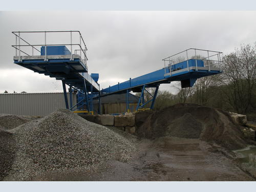 This system is also capable of delivering 10tph (average) with a maximum of 15tph of grit (including rounded glass) and was also constructed with CMC. This system involved four sections which receive material from the discharge chute of existing processing machinery into the receiving hopper of the first, 7m long - 21◦ inclined conveyor which in turn feeds into a simple receiving hopper of a second, 19m long - 22◦ inclined conveyor. Material then feeds onto the penultimate section into another hopper of a 22m long - 7◦ inclined conveyor which subsequently delivers feed into the hopper of the last section which is a 16m long horizontal conveyor which delivers the feed material to stockpile. This last section includes an 18m long walkway up to the drive end on one side only and around the head.