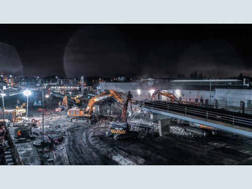 Working alongside specialist subcontractor S Evans & Sons Demolition, principal contractor, Tarmac employed seven excavators to remove the flyover – four of which were among the largest machines of their type currently being used on the UK road network.