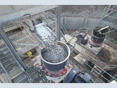 Blasted limestone is fed through a primary crusher at a rate of 450tph and processed through an impactor and sizing screen. The 40-160mm product enters the secondary crushing phase, a Terex MPS MC320 cone module, then to the Cedarapids MHS6203 modular screen. Finally, oversized material from the Cedarapids MHS6203 goes to the tertiary Terex MPS MC320 cone module before re-entering the MHS6203. The final output achieved is varied limestone aggregates including -4/4-6/6-10/10-14/14-20mm.