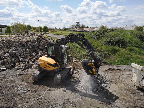 With a MECALAC 8MCR excavator and an MB-C50 crusher bucket, a French company specialized in groundworks and construction of swimming pools reuses the demolition waste instead of sending it to the landfill, thus reducing disposal costs, and pollution while respecting the residential area where they work.