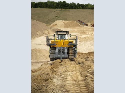 The task was the production of high-quality building sand at one of Tarmac’s quarries in Nottinghamshire. Experienced operator Stuart Kahler was the man entrusted with ripping and pushing the material into a stockpile allowing the quarry to screen the material ready for delivery. Whilst out of the ground the sand is relatively soft and lightweight, in the ground it is totally the opposite - hard packed and abrasive. Stuart’s task was ripping and pushing an existing face with all work carried out downhill. The area, approximately 100m was ripped down the slope then across at about 40 degrees to break up the material as much as possible before the tractor was turned to face down the slope and push the material to the quickly growing pile at the bottom. With material quickly piling up in front of the blade the Liebherr just dug in and pushed with extraordinarily little change in speed and performance despite pushing a large wave of material before it.