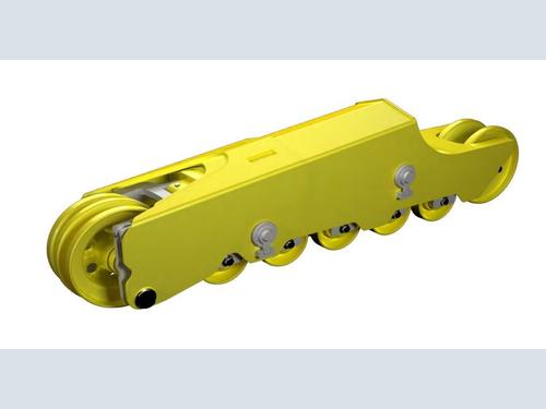 For the frame which surrounds the rollers, Berco created an innovative solution featuring a suspension system, with two tilting structures inside the frame that allow the rollers to reduce ground irregularities. The rollers are assembled in a two-by-two formation which allows them to tilt and move