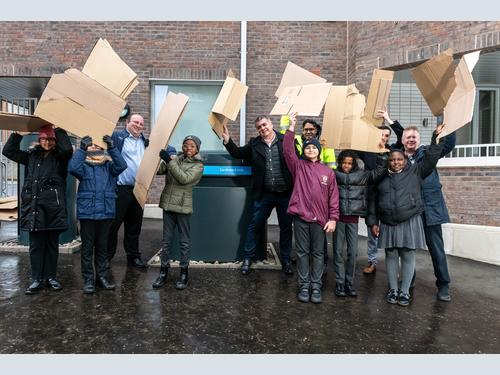 The 88cm wide cardboard shredder, which can shred packaging as large as TV boxes, is the largest ever to be used in a residential environment. It is also the first time that residential cardboard collection has been handled by vacuum waste collection in the UK, which will see large volumes of cardboard ‘sucked’ in an underground pipe network from the shredder to the collection station every day.