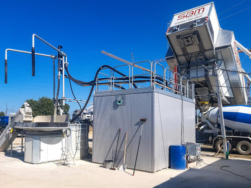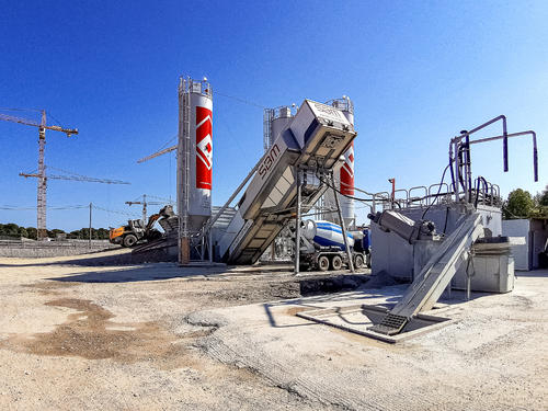 The Pfeiffer Bau “truck fleet“ consisting of 18 machines including already five supermobile concrete mixing plants of the series EUROMIX® was even further expanded to meet the demands of the large building project at the future Munich educational campus. In spring 2020, SBM delivered a plant EUROMIX® 3300 SPACE, a mobile processing plant for residual concrete, and a mobile heating plant. The modular combination of these three plants ensures smooth and simple flow of construction activities regardless of weather conditions. Thanks to the “supply from a single source” SBM guarantees optimum co-ordination of all interfaces – as all plants act like in a closed-circuit-system. Especially the recycling plant for residual concrete is an economically important and environmentally friendly supplement of the concrete mixing plant. There, the used washing water is processed for the truck mixer and the mixer cleaning, and the residues gained are fed back into the concrete production.