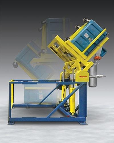 After securing the bin in place with a safety-interlocked door, a pair of hydraulic cylinders raises the bin vertically, seating its rim against the underside of a rectangular discharge hood. A second pair of hydraulic cylinders then elevates and tips the assembly, causing the discharge spout on the hood to mate with a gasketed inlet ring fitted to the lid of receiving hoppers, storage vessels or process equipment for total dust containment.
