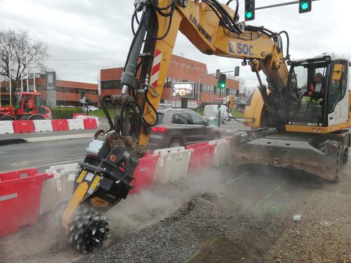 To satisfy these requirements the French contractor chose an MB Crusher MB-R700 twin header to trace the route of the new tram. The MB-R700 hydraulic cutter installed on a Liebherr 914 excavator made it possible to limit vibrations and its design to reduce noise pollution worked in favour of this urban project.