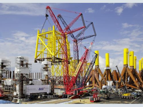 At the ABC-Halbinsel offshore terminal in Bremerhaven, the jacket representing the underlying substation plat-form structure of the "Borkum West II" offshore windpark was fitted using two 750 tonne crawler cranes. The challenge here was not simply to hoist the exceptionally heavy load in tandem. The key issue was to move both cranes while 70 m apart with this load on the hook.
