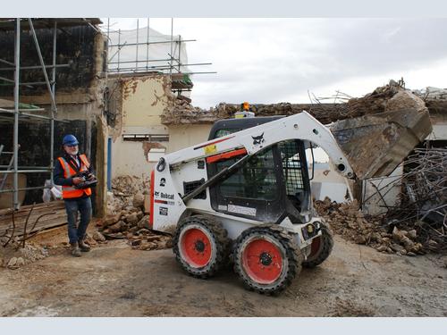 The UK’s first Bobcat Remote Control compact loader has increased safety and reduced costs on a major demolition contract in London. Purchased by BooBoo Plant Hire, based in Kings Langley, and supplied by Bobcat of London, the local Authorised Bobcat dealer, the Remote Control S450 skid-steer loader is working on the top-down demolition of a former wing of the Whittington Hospital in Upper Holloway in North London, being carried out by main contractor, Kent-based Erith.