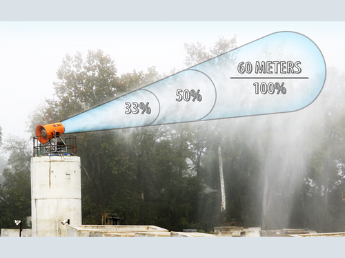 Another example would be concrete curing, where atomized mist has proven successful in controlling humidity for maximum strength of the finished product. On airport runways and other large projects, the 60-meter throw distance may be desirable, but on smaller pours, contractors may want to dial it back to a fraction of that. With the VFD, they can easily do so, without having to use smaller models.