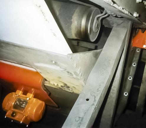 Prompted by customer requests, Martin engineers observed that the majority of the buildup released by secondary cleaners collected at the rear of the chute mouth, where a sloped surface can trap carryback. According to Dan Marshall, Product Engineer for Martin Engineering, “We discovered that this could happen with nearly every discharge chute conveying adherent material. In some cases, even chutes treated with a low-friction coating can experience buildup. It’s only with the persistent disruption from vibration that we found materials flowed consistently.”