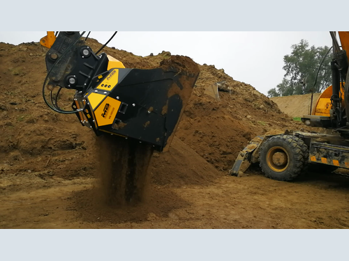 Let's move on to Poland, where a company used an MB-HDS320 shafts screener on a JCB JS175 excavator to screen wet soil and use it to reinforce river banks. The soil tended to turn into mud, but, thanks to the RQ50 shaft kit and the MB shafts screener enabled the customer to achieve their desired results. The RQ50 shaft kit is ideal for: screening soil, damp inert materials, selecting material for composting, and aerating soil.