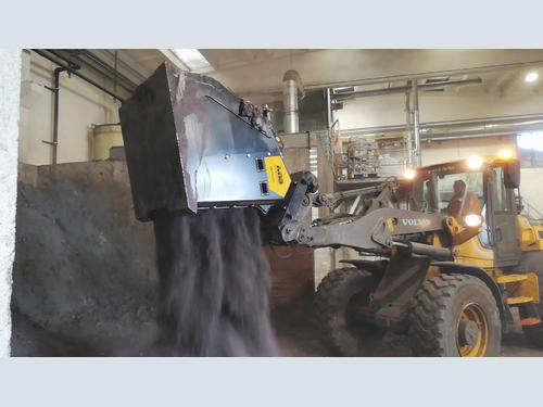 The bags contained dust from vehicle paint equipment. The MB-HDS314 shafts screener, installed on the Volvo L50 loader with the RM shaft kit, broke down the dust that turned into mud from the damp conditions.