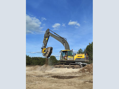 In Latvia, our customer has been accumulating granite in his sand quarry as an overburden. Stockpiling the rocks was a waste, so they attached a BF90.3 jaw crusher to their Volvo EC220 excavator to process the rocks directly at the quarry a one-man one-machine job.