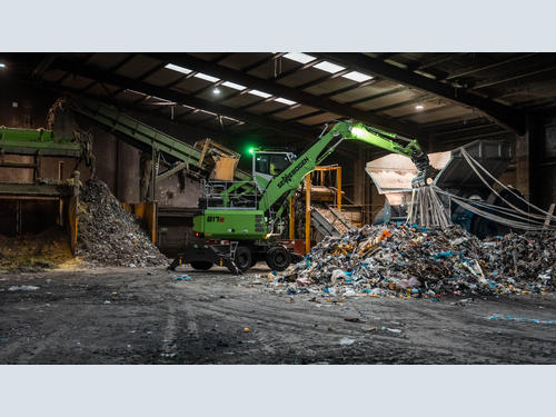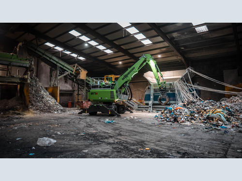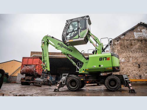 “We have used a variety of machines over the years, mainly on tracks.” Martin Bickerstaff, Yard Manager commented. “When we came to look at replacement material handler, we decided to change tact and go for a more mobile, wheeled machine. We did have an issue though as the building size limits what we can squeeze into it. After looking at various products we decided that a Sennebogen 718E was the ideal solution in terms of size and capabilities as it has to be able to load the plant, sort material out and load wagons with outgoing material.”