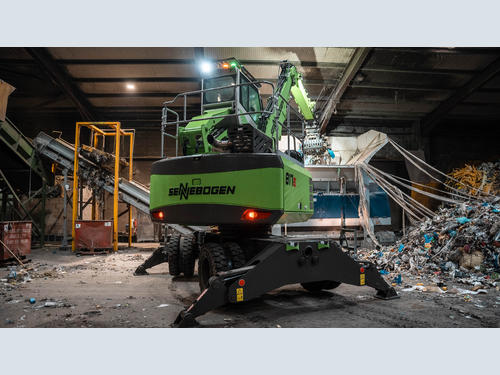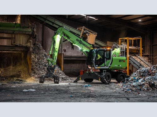 Working in the dark and often dusty environment, Sennebogen’s standard LED lighting package cuts through the gloom with ease.