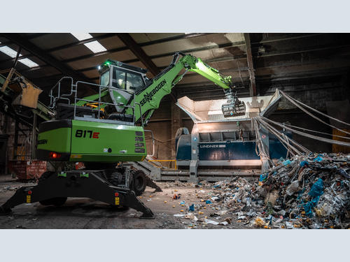 The 817E is the smallest material handler in the German manufacturer’s range. Built at their Straubing plant near Munich, the 18.5 tonne material handler comes with a 8.5m pin height and reach allowing it to easily fill the bulk tippers leaving the site. The impressive ground level reach of 8m means it can service the Linderer shredder from a single point whilst remaining far enough away from the sloping roofline. The machine’s industrial K8ULM configuration allows it to carry a 300-litre rotating selector grab.