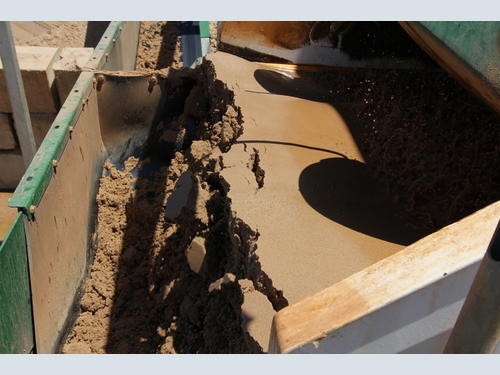 The +3” material is delivered to an oversize stockpile from the top deck of the rinsing screen on the M4500 with the material between ¼” to 3” is transferred to the AggMax. Once the gravel has been scrubbed to remove clays, it is being stockpiled into 3 product grades: 3/8” minus, 3/8” – 1” and 1” to 2 ½”. The 1” to 2 ½” is conveyed from the screen to a Cemco Model 80 vertical impact crusher where it is crushed to sand and smaller gravel particle sizes. The AggMax also includes a dewatering screen at the rear which accepts the lightweight organics floated off from the gravel fraction and dewater these before stockpiling in a product bay underneath the machine.