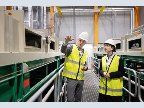 Climate and Environment Minister Romina Pourmokhtari and Mikael Hedström, CEO of Ragn-Sells Treatment & Detox, during a tour of the factory.