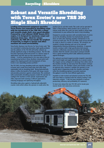 Tony Devlin, Business Line Director for Terex Ecotec said, “We are committed to delivering innovative, high quality products and the addition of the TSS 390 will further enhance an already significant range of shredding products. The TSS 390 has been rigorously tested and proven in a diverse range of applications and will open up new opportunities in the market. It will be manufactured in our new state-of-the-art manufacturing facility in Derry, Northern Ireland which will support the ongoing growth and development of Terex Ecotec’s ever expanding product portfolio.”