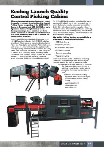 Offering the complete materials recovery range, Ecohog have recently launched Quality Control Picking Cabins comprising of the QCM-1200P (3 Bay up to 6 persons) and QCS-1200 (2 Bay up to 4 persons) Cabins. Complementary to the Ecohog core range, these auxiliary products enable customers to retrieve any final materials that could potentially add value or devalue the end recovered materials.