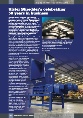 It is an exciting time for Ulster Shredders as they continually grow and develop within the shredding industry. For more information on Ulster Shredders and their shredder range email info@ulstershredders.com or visit www.ulstershredders.com.