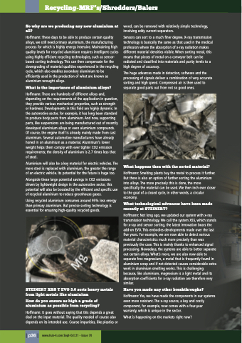 Hoffmann: These days to be able to produce certain quality alloys, we still need primary aluminium, the manufacturing process for which is highly energy intensive. Maintaining high quality levels for recycled aluminium requires intelligent cycles using highly efficient recycling technologies, such as sensor- based sorting technology. This can then compensate for the downgrading of material qualities experienced in the recycling cycle, which also enables secondary aluminium to be efficiently used in the production of what are known as aluminium wrought alloys.