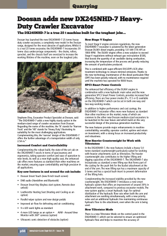 In addition to higher performance and cost savings, the DX245NHD-7 excavator offers more new features as standard than other machines on the market, many of which are common to the other new Doosan medium-sized excavators to be launched in the near future and which build on the very successful design of the previous generation machines.