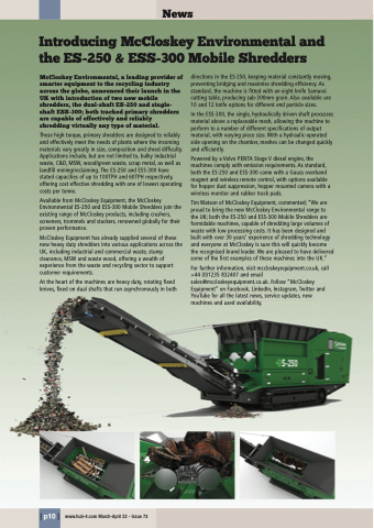 McCloskey Environmental, a leading provider of smarter equipment to the recycling industry across the globe, announced their launch in the UK with introduction of two new mobile shredders, the dual-shaft ES-250 and single- shaft ESS-300; both tracked primary shredders are capable of effectively and reliably shredding virtually any type of material.