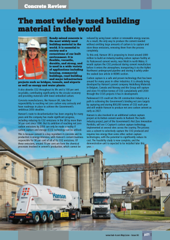 To this end, Hanson UK is proposing to invest around £400 million to build an industry-leading carbon capture facility at its Padeswood cement works, near Mold in north Wales. It would capture the CO2 produced during cement manufacture before it enters the atmosphere, transporting it via the HyNet Northwest underground pipeline and storing it safely under the seabed (see article in NEWS section.