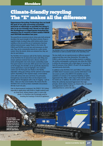 Eggersmann Recycling Technology has set itself the goal of not only recovering recyclable materials as efficiently as possible but doing it also in an eco-friendly way. Based on this ideal the EcoEngineers at Eggersmann launched the emission-free E-versions of their mobile FORUS and TEUTON shredders last year.