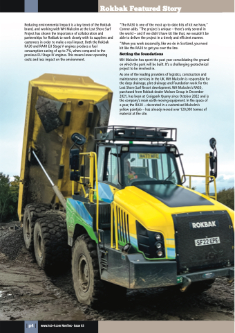 As one of the leading providers of logistics, construction and maintenance services in the UK, WH Malcolm is responsible for the deep drainage, plot drainage and foundation work for the Lost Shore Surf Resort development. WH Malcolm’s RA30, purchased from Rokbak dealer Molson Group in December 2021, has been at Craigpark Quarry since October 2022 and is the company’s main earth-moving equipment. In the space of a year, the RA30 – decorated in a customised Malcolm’s yellow paintjob – has already moved over 120,000 tonnes of material at the site.