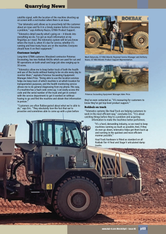 “Telematics allow me to keep better track of both the health and use of the trucks without having to be on-site every day to monitor them,” explains Potomac Excavating Equipment Manager Aden Price. “Being able to use the location services helps me keep track of which machine is at which location for transportation purposes, and the health monitoring service allows me to do general diagnosing from my phone. This way, if a machine has a fault code come up, I can easily access the code and the serial number of the truck and get in contact with the service department to get it worked on without having to go and find the machine and obtain that information in person.”
