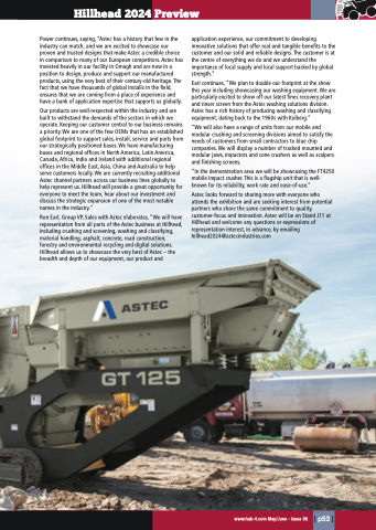 Our products are well-respected within the industry and are built to withstand the demands of the sectors in which we operate. Keeping our customer central to our business remains a priority. We are one of the few OEMs that has an established global footprint to support sales, install, service and parts from our strategically positioned bases. We have manufacturing bases and regional offices in North America, Latin America, Canada, Africa, India and Ireland with additional regional offices in the Middle East, Asia, China and Australia to help serve customers locally. We are currently recruiting additional Astec channel partners across our business lines globally to help represent us. Hillhead will provide a great opportunity for everyone to meet the team, hear about our investment and discuss the strategic expansion of one of the most notable names in the industry.”