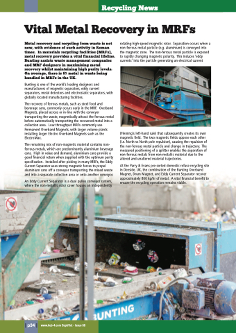 At the Parry & Evans pre-sorted domestic refuse recycling site in Deeside, UK, the combination of the Bunting Overband Magnet, Drum Magnet, and Eddy Current Separator recover approximately 800 kg/hr of metal. A vital financial benefit to ensure the recycling operation remains viable.