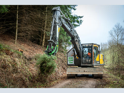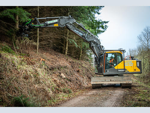 At the business end of the new sixteen-tonne machine, Scott Young junior interchanges attachments between the Steelwrist tilt rotator and a mulcher. “The machine has plenty of power to operate the mulcher and, in conjunction with the priority control valve, makes it highly responsive,” comments Scott Young junior. “Using the Steelwrist tilt rotator in conjunction with the two piece boom makes the machine very versatile as well, especially when I’m working on narrow forest tracks and up against embankments.