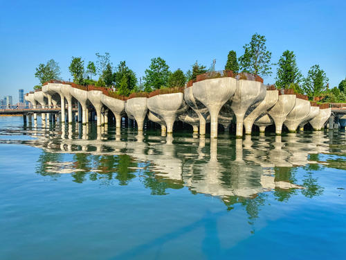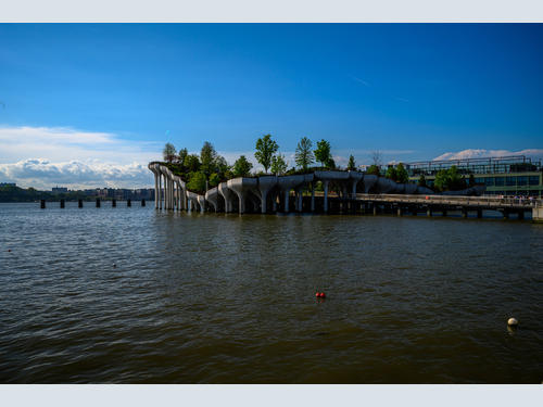The planning phase for Pier 55, now known as "Little Island", dates back almost ten years, with the foundation stone being laid in 2018: Concrete piles had to be driven into the ground to make the island, designed to accommodate several thousand people, possible. The project was realized through partnership with the Hudson River Park Trust and funded primarily through Barry Diller and the Diller-Von Furstenberg Family Foundation. The free public park pier within the larger Hudson River Park opened in May 2021.