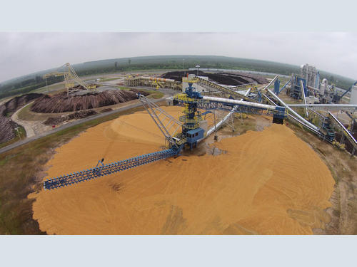 Bruks equipment at Cottondale includes a large circular blending bed stacker reclaimer (CBBSR). Huge wood chip piles are built continuously in a 360-degree rotational pattern, where successive layers of material are laid down using a stacking conveyor that pivots through a complete circle as the pile grows.