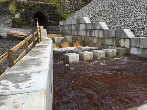 The design work for the project was undertaken jointly by Story Contracting and engineering consultant AECOM. With the worksite being pretty much in the middle of nowhere and sited within a deep ravine, in-situ concrete pours were ruled out. The decision was therefore taken to use pre-cast concrete interlocking blocks to construct the weir and retaining wall. Elite Precast Concrete of Telford is a specialist in this field and produces many ranges of interlocking blocks, troughs, anchor blocks, barriers and posts. Its Legato range seemed ideal.