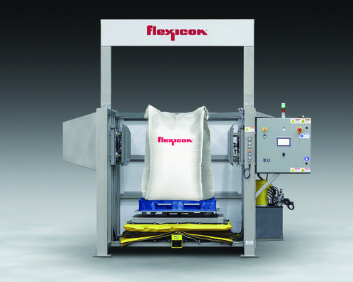 A new BLOCK-BUSTER® Bulk Bag Conditioner from Flexicon Corporation features a laser safety curtain that automatically stops the system's hydraulic rams, scissor lift and turntable if the laser beam is obstructed, eliminating the need for safety-hinged doors and interlock switches for operator safety.