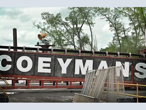 Like many other facilities handling bulk materials, the Port of Coeymans limits fugitive dust emissions by employing a couple of simple methods. One is limiting the distance the dust-emitting cargo travels from the ship’s hold to the dock. This is done by using a clamshell shovel suspended from a crane to slowly unload the material into a tall portable hopper with a baghouse dust collection system.