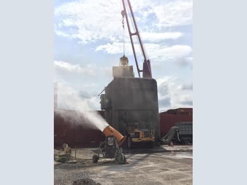 Operators report that air quality at the port has significantly improved during the unloading of clinker and other dusty materials, and that fugitive dust emissions have not been seen leaving the site since adding the units to the facility’s dust management plan. The cannons are easily positioned on the dock, taking up little room and covering a large area, allowing crane operators to transfer material from hold to hopper more efficiently. The industrial park has experienced a noticeable improvement in air quality, especially when a DB-60 is in operation during dry and windy periods.