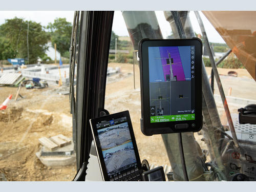 The two systems have been fully integrated, with all of the machine´s buckets pre-programmed into the Topcon unit. This means that the Topcon system not only knows where the tip of each bucket is in normal use, it can also detect the exact position while the tilt-rotator is in operation.