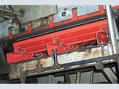 - Preventing belt sag between idlers – The belt can dip slightly between idlers, creating gaps between the belt and skirting that allow dust and fines to escape in the loading zone. Using an impact cradle with shock-absorbent polyurethane bars reduces impact strain on the belt and ensures an even belt plane without gaps between the skirting and belt. Cradles can extend along the entire length of the stilling zone.