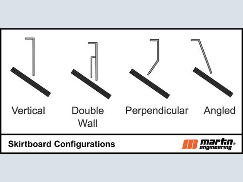 The perpendicular and angled configurations are used in some industries. Angled skirtboards are designed to allow the load to center. Perpendicular skirtboards relieve side pressure on the skirtboard seal.