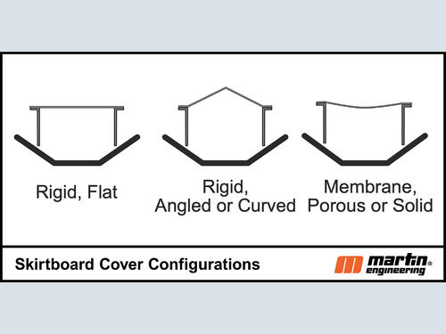 Plastic covers are sometimes used to reduce weight. Regardless of the cover design, the most critical design feature is ease of access. When there is a lot of positive pressure in the enclosure, sealing the covers becomes an issue. Porous covers are sometimes used to reduce positive pressure, but the most common membrane applications are rubberized fabric with continuous grip edges that can connect between vibrating equipment, such as screens, and the skirtboard enclosure.