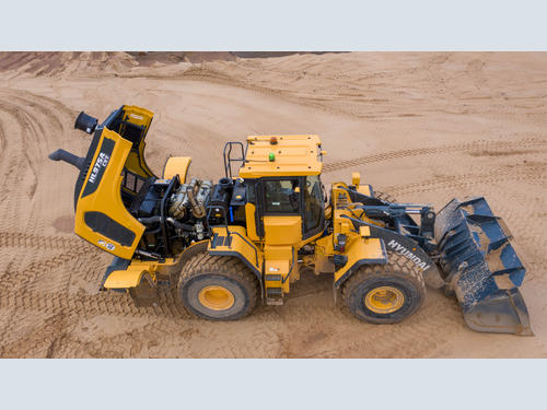 Hyundai has combined a tried and trusted combination of ZF axles and a state-of-the-art ZF CVT transmission in the 27-tonne loader. The CVT transmission offers optimised power output by continually changing the ratios of hydraulic to mechanical energy depending on load and speed of the machine and keeps the engine in a low rpm range to offer smooth, seamless acceleration. During deceleration, the CVT acts as a brake, reducing wear on the service brake and prolonging the life of the axle oil.