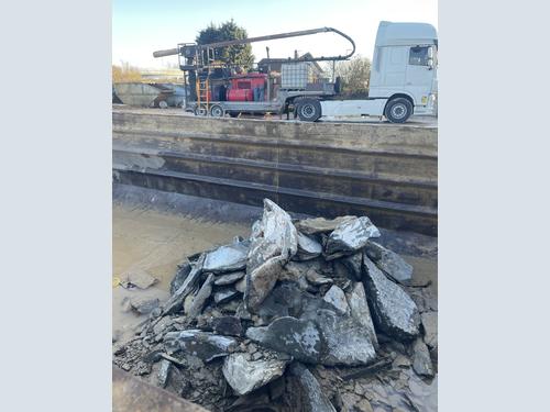 The machine will typically remove up to 1.5cm of hardened concrete within about 90 minutes using high pressure water operating at 20,000 psi ,which is forced between the drum mixing blade and the hardened concrete to split it away, as the drum slowly rotates during the cleaning process. At the end of the process, the water which contains the removed build up, is discharged from the drum and recycled, and the removed material is sent for crushing at the company’s site.